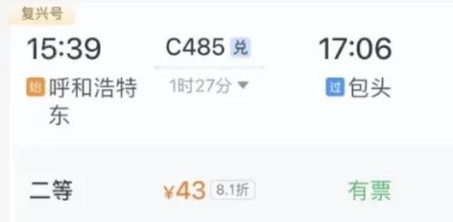 100积分相当于1元人民币,也就是说,如果您想兑换一张呼和浩特到包头的G485次列车二等座的车票,需要使用积分4300
