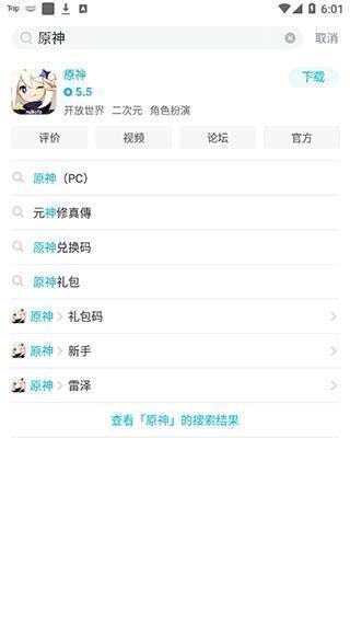 2、其次点击首页中右上方的搜索标志,输入游戏名称,如原神,该游戏的相关信息就会显示出了。