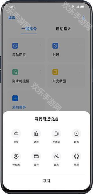 点击「附近」进行设置,完成默认应用设定后点击「附近」即可寻找美食、酒店、加油站、超市等不同设施,自动打开地图应用。