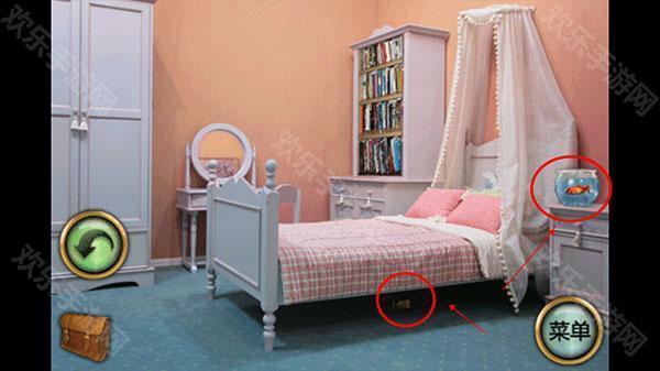 5、进入右边第二个房间,找到桌子上的鱼缸,收集起来(后面可以用来灭火),找到床底下的棋子。