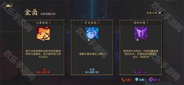 太子的觉醒分为三系:神剑——强化元素伤害,天人——强化烟雾手雷,奇术——强化源力法球。玩家根据自己的喜好去选择每次觉醒的方向,让英雄成长为自己想要的样子。