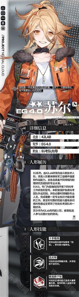 EG系列,由42Lab研发的战斗类技术人形,该类人形素体拥有军工级硬件强度和作战能力,且各自具备不同领域内助理研究员级别的专业水准。