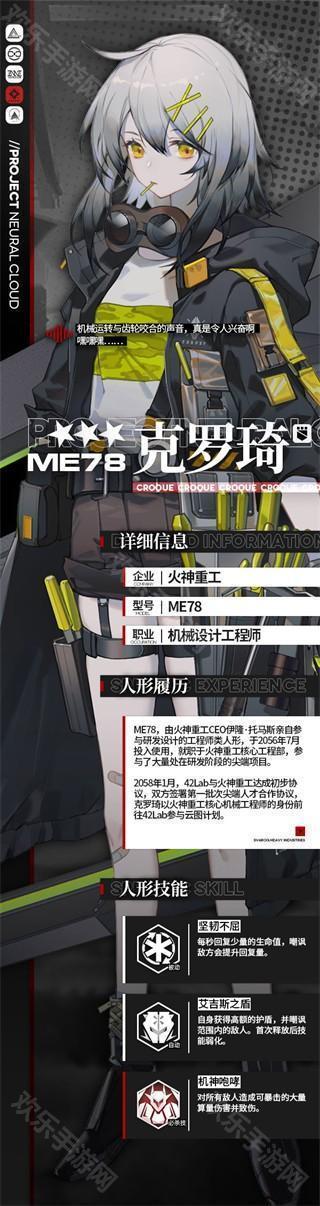 ME78,由火神重工CEO伊隆·托马斯亲自参与研发设计的工程师类人形,于2056年7月投入使用,就职于火神重工核心工程部,参与了大量处在研发阶段的尖端项目。