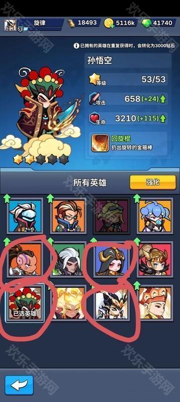 6.关于英雄选择,买个猴子就够了,开永久卡中间四个英雄直接送,永久卡得开,划算,下图标红的四个英雄着重注意,主升猴子以后,多出来的英雄精华要升这几个英雄,原因是因为在20级和80级时这四个英雄有全体加攻击暴击的buff,