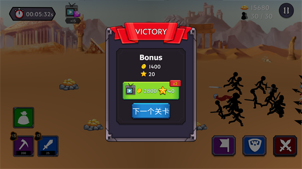 2、游戏的玩法很简单,玩家需要合理的安排阵容并在战争中击败敌方火柴人,界面左侧可以选择购买的兵种,右侧分别为集合、防御以及攻击,游戏的左上方会显示当前关卡所耗时间,右上方则是金币以及兵种数量。