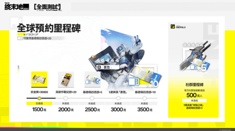 PC 与行动版全面支援跨平台资料同步,画面与操作体验同步升级。管理员提前完成事前预约可获得:基础寻访凭证、五星干员「昼雪」 等奖励,当官方社群达成 500 万追踪数时将解锁特别奖励。
