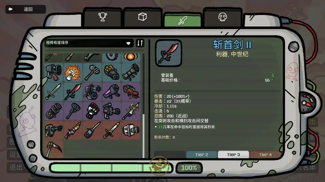 内容:分为两部分——游玩进度:成就、统计数据,和详细资讯:道具、武器、敌人的属性、效果、解锁方式。